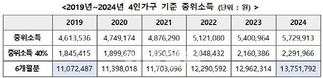 올해 4인가구 기준 중위소득의 100분의 40(229만1966원) 기준 6개월분 생계비는 1375만원 수준이다.